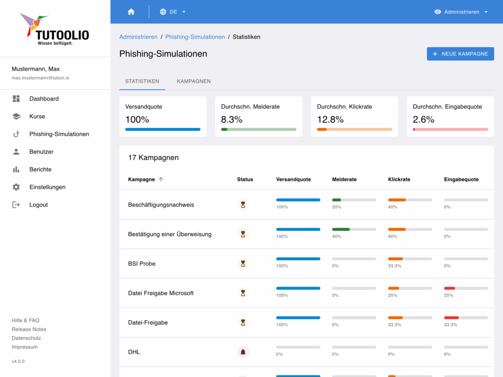 Sehen Sie sofort, wie viele Mails zugestellt, geöffnet, angeklickt oder gemeldet wurden – für schnelle Reaktionen und gezielte Nachschulungen.